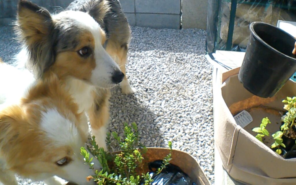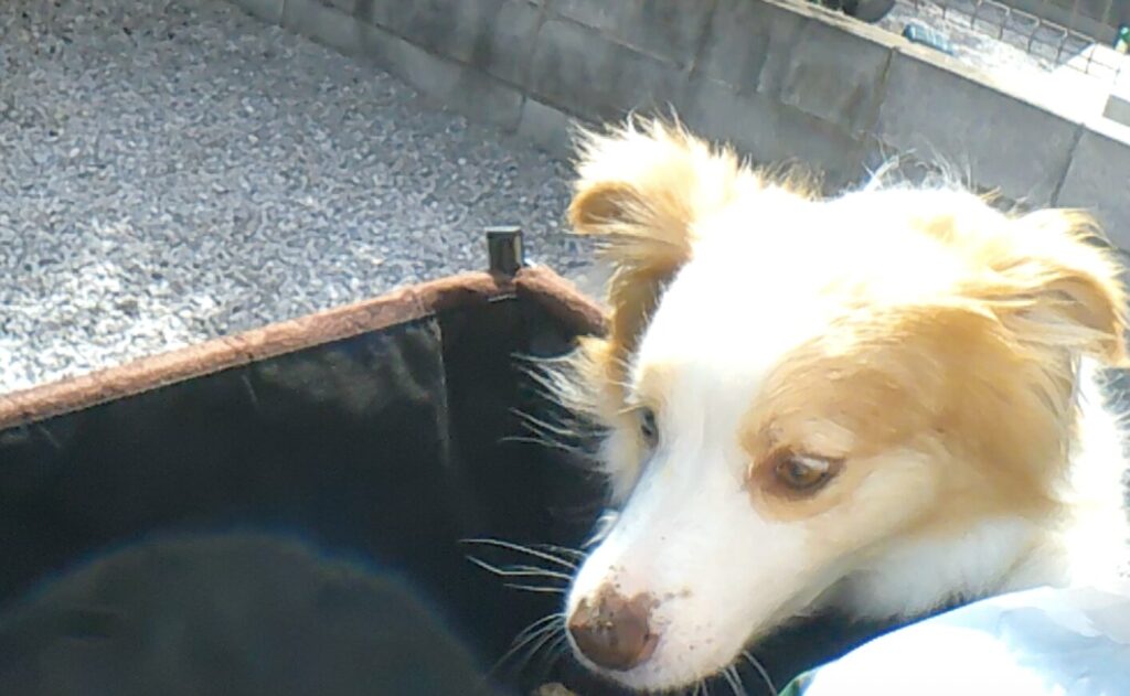 今度はゆっちがきて籾殻の上から入れてる土が気になるようす