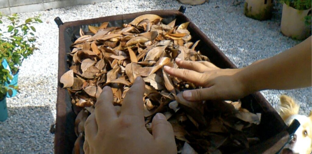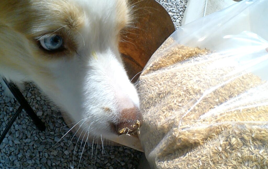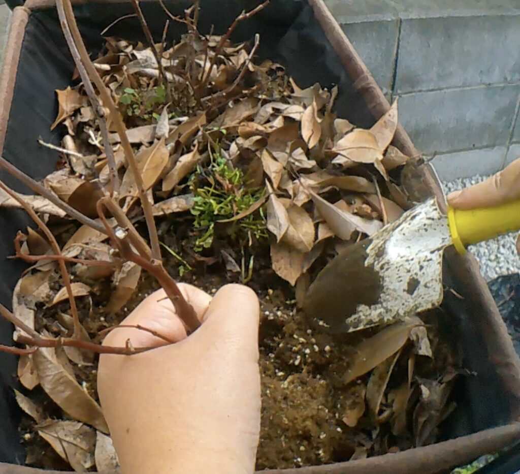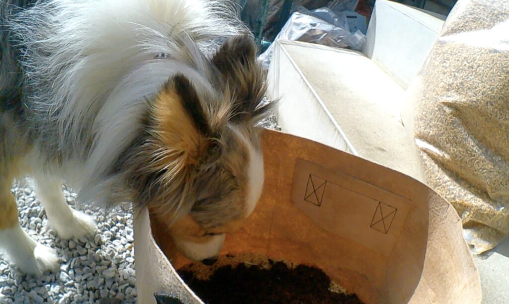 鉢底に入れる籾殻が気になるはっち。鼻についてる…w