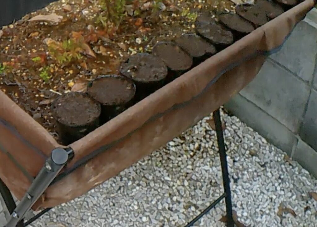 早速余っていた野菜の土とちょうど良さそうな感じに熟成させてたコンポストの土があるのでまぜまぜ…保管してたプランターのマルチに穴を開けて……
